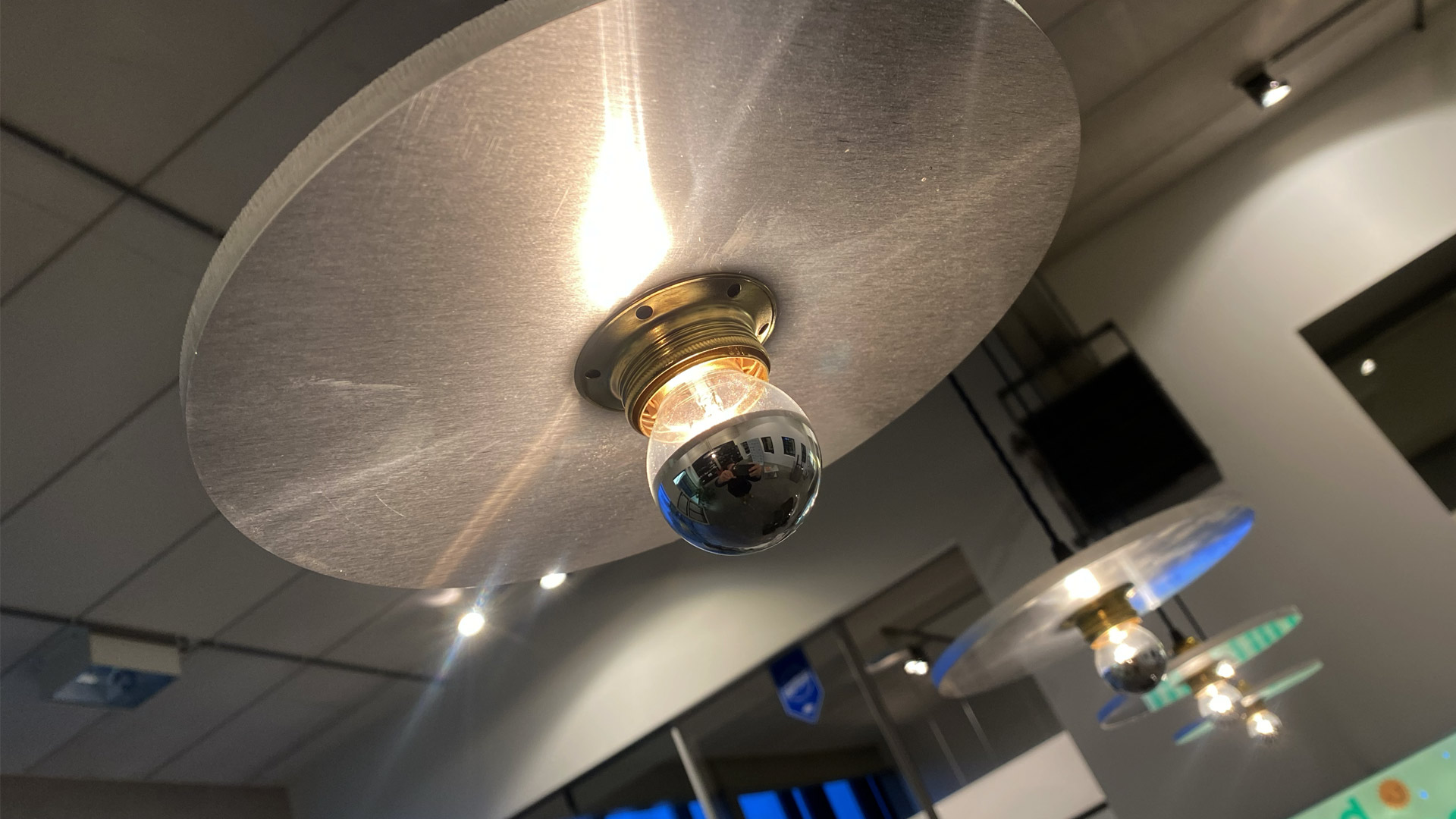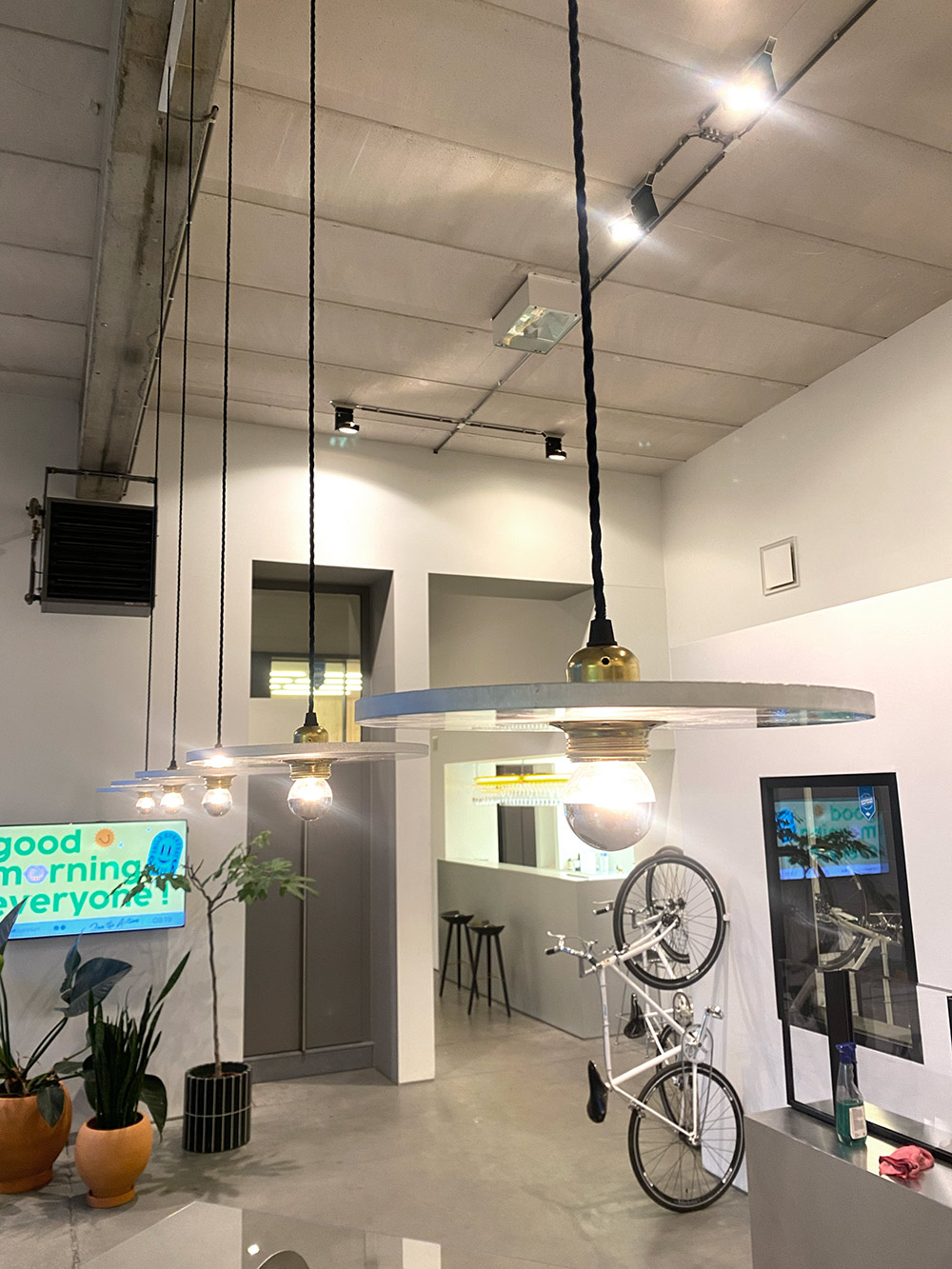 This unique pendant lamp is a perfect fusion of industrial style and modern flair. The design is built around a solid disc of 1 cm thick gross aluminum, which has a robust and powerful appearance. This disc acts as the focal point of light and emits an atmospheric glow, enhanced by the clear mirror light attached in the brass fittings. The brass fitting adds a touch of elegance and creates a nice contrast to the raw aluminum. The blue textile cable completes the look and adds a playful, contemporary touch. Perfect for over a dining table or as an eye-catcher in a living room.