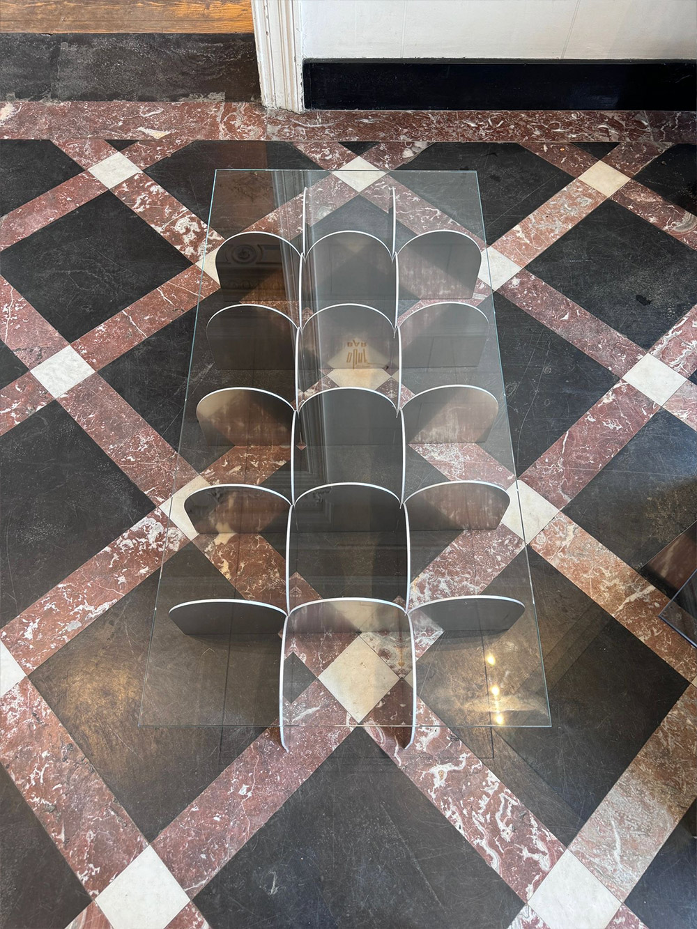 Brute aluminum parts are brought together in a simple and aesthetic design. The flat base and arched top slide together in a cross shape, with the tension between the parts ensuring that they remain firmly in place. This design offers both stability and a playful dynamic to the whole.