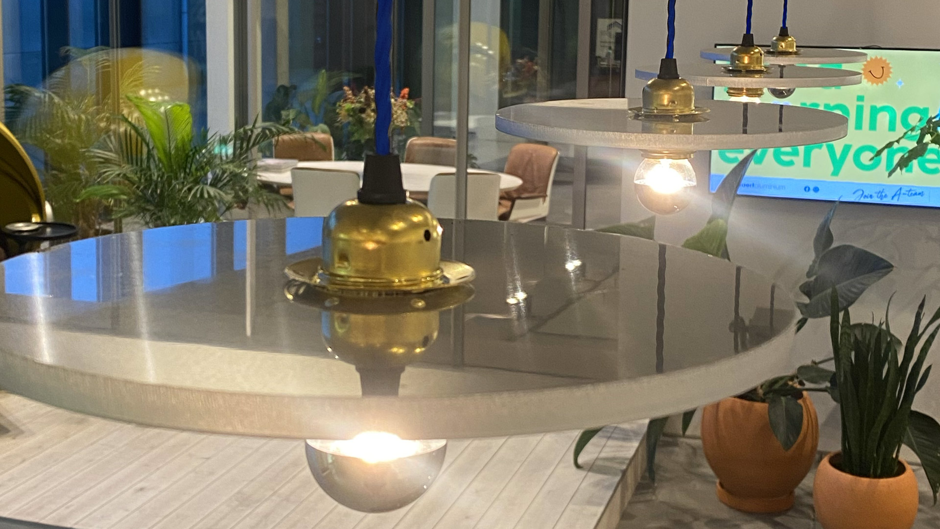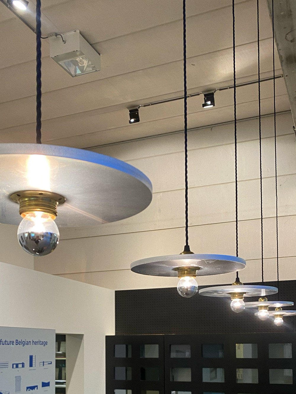 This unique pendant lamp is a perfect fusion of industrial style and modern flair. The design is built around a solid disc of 1 cm thick gross aluminum, which has a robust and powerful appearance. This disc acts as the focal point of light and emits an atmospheric glow, enhanced by the clear mirror light attached in the brass fittings. The brass fitting adds a touch of elegance and creates a nice contrast to the raw aluminum. The blue textile cable completes the look and adds a playful, contemporary touch. Perfect for over a dining table or as an eye-catcher in a living room.
