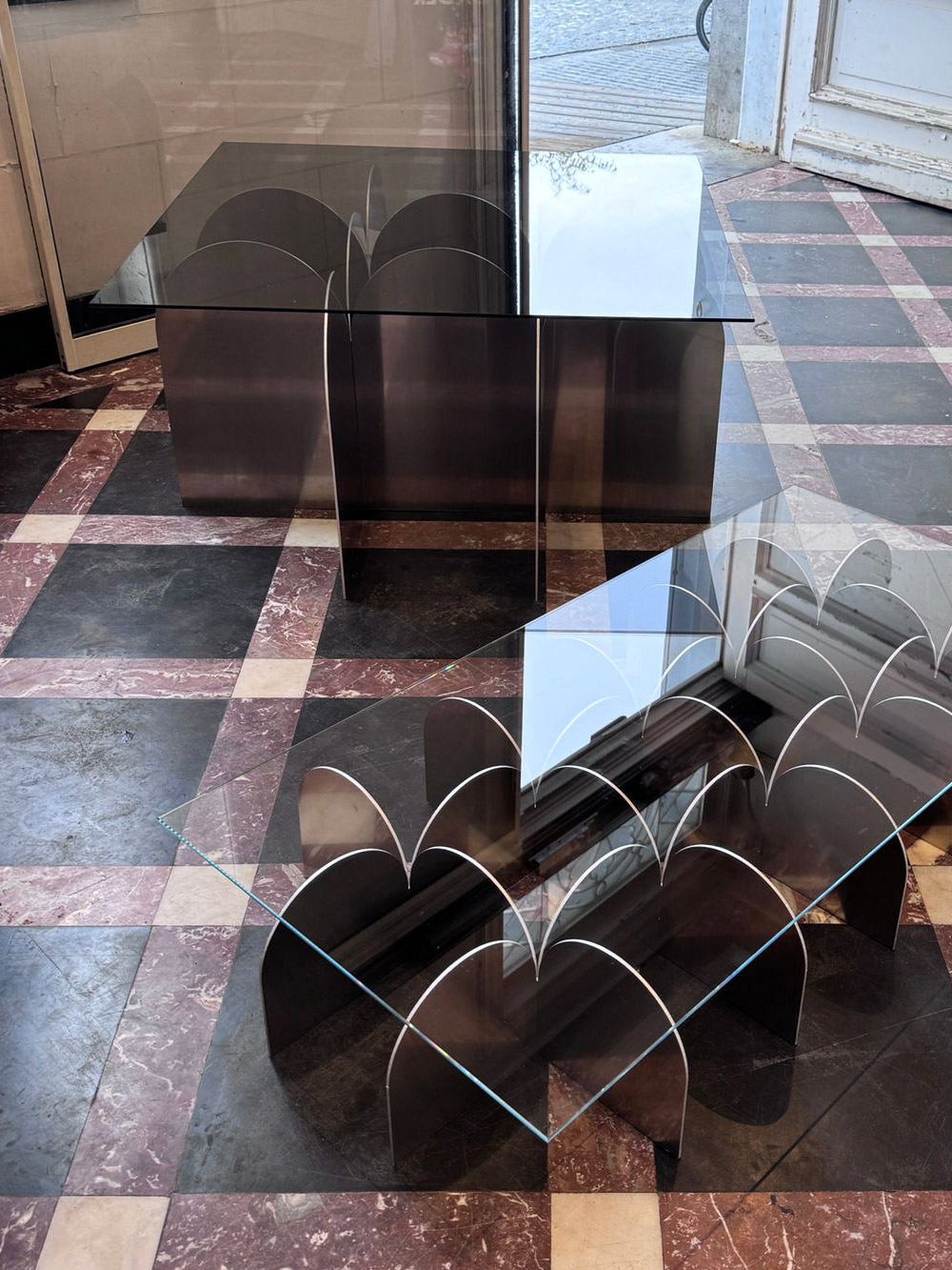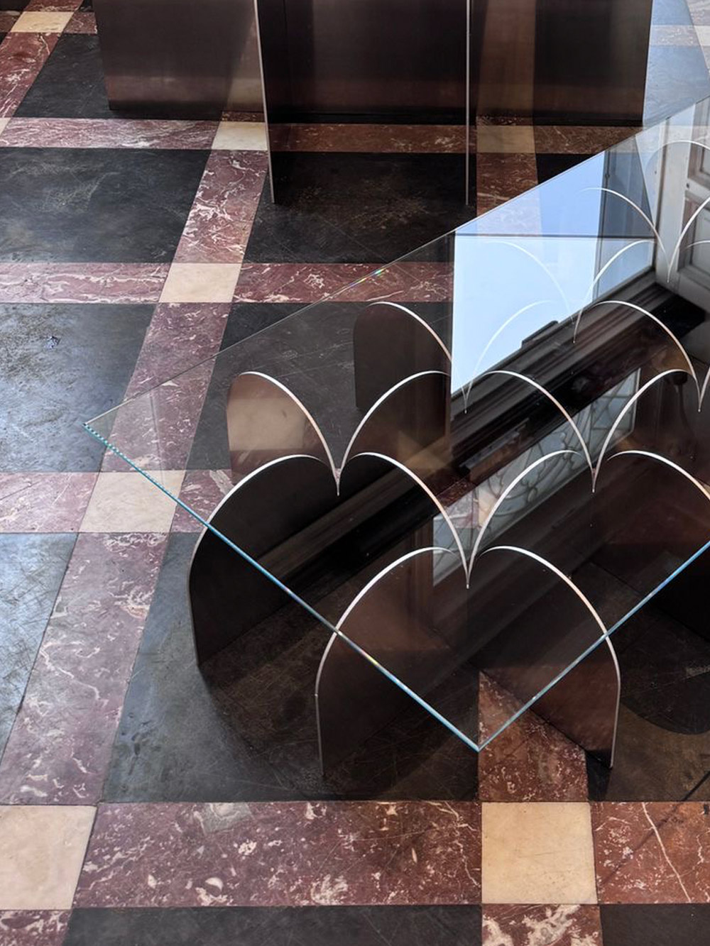 Brute aluminum parts are brought together in a simple and aesthetic design. The flat base and arched top slide together in a cross shape, with the tension between the parts ensuring that they remain firmly in place. This design offers both stability and a playful dynamic to the whole.