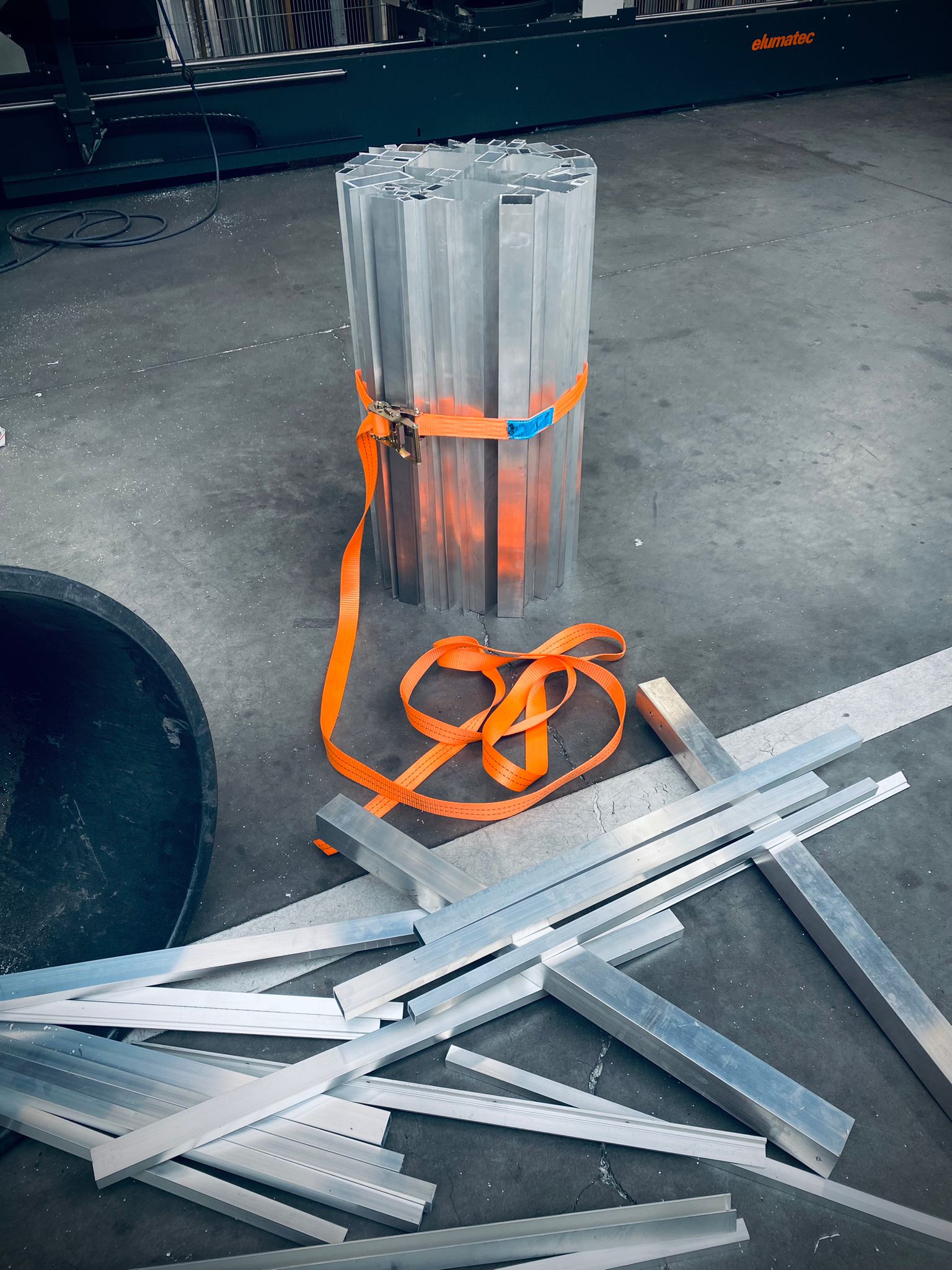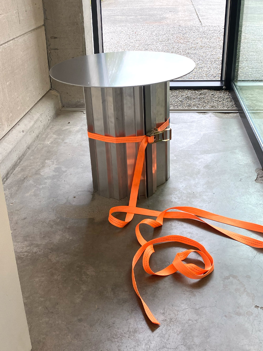 This striking table combines strength and fragility in an innovative design. The table leg is constructed from a mix of brutal aluminum sections and tubes, with the parts brought together in a special way. Instead of being glued or screwed together, they are held together only by a fluorescent tensioning strap, adding not only a modern aesthetic element, but also a sense of tension and dynamism. The table top, a solid disc of brute aluminum, complements the robust look of the leg. Despite its robust appearance, the table exudes a fragile elegance, making it an intriguing statement piece in any interior. This table invites use, but also raises questions about the balance between strength and fragility in design.